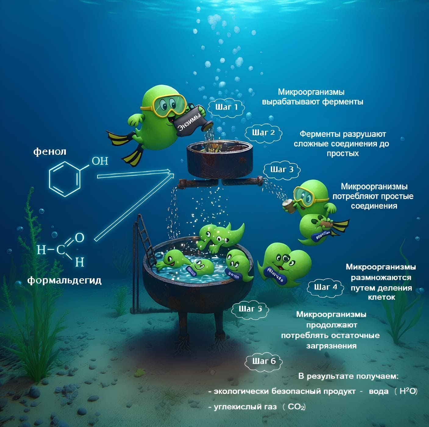 Биорегенерация водного абсорбента осуществляется с помощью дружественных человеку микроорганизмов-деструкторов для последующего многократного использования очищенной воды в замкнутом контуре установки – сток в канализацию отсутствует.
