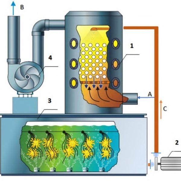 — Насадочный скруббер АБХУ создан специально для абсорбции газов. В нем обеспечивается огромная поверхность контакта фаз (газ-жидкость) на подвижной насадке и, что самое важное, длительное время пребывания газа в зоне контакта. Это позволяет процессу диффузии пройти полностью, растворяя или конденсируя фенол, формальдегид и амины в воде.