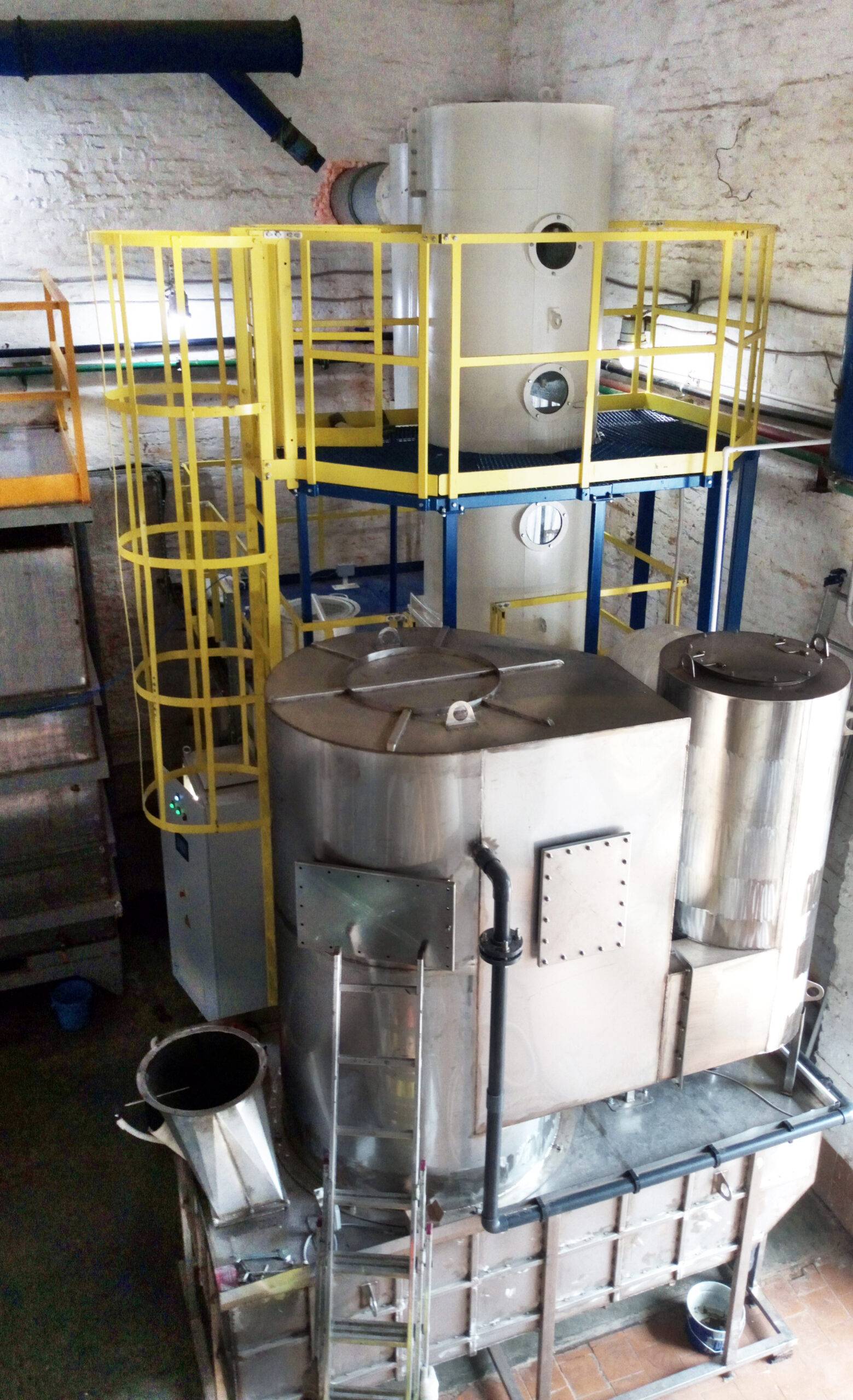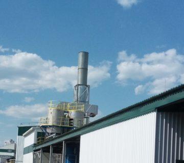 Двухступенчатая система очистки вентиляционного воздуха от аммиака, ЛОС. Кроме основных составных частей АБХУ (скруббер, биореактор, вентилятор и водяной насос) установки были укомплектованы дополнительным контуром для очистки вентвоздуха от аммиака: скруббером с кольцевой насадкой для улавливания аммиака и аппаратом первичного (подкисленного) абсорбционного раствора для нейтрализации аммиака. Газоочистка от сушильных камер линии импрегнирования происходит в несколько этапов: